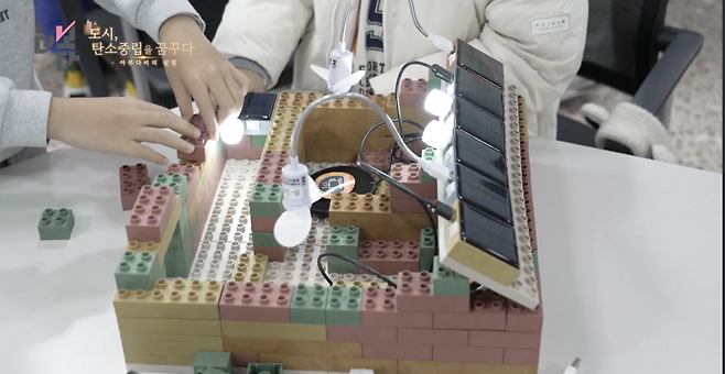 블록 쌓기에 푹 빠진 어린이들. 탄소 배출을 줄이는 친환경 집 만들기를 체험하고 있습니다.