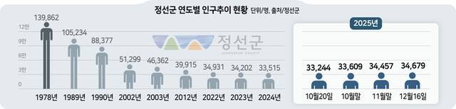 한때 정선군은 석탄산업 전성기였던 1978년 인구가 13만9862명으로 정점을 찍었으나, 1990년 8만8377명으로 10만 명 선이 붕괴됐다. 이후 지속적인 감소세를 보이며 2014년에는 인구 4만 명 선이 무너져 3만9752명을 기록했고, 농어촌 기본소득 신청 당시인 지난 8월 말 기준 인구는 3만3279명으로 집계됐다.