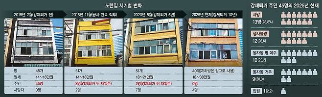 2015년 퇴거당한 주민 중 그해 말 노란집 거주자는 8명(퇴거 불응 4명+재입주 4명)이었다. 5년이 흐른 2020년엔 2명만 남았다.
