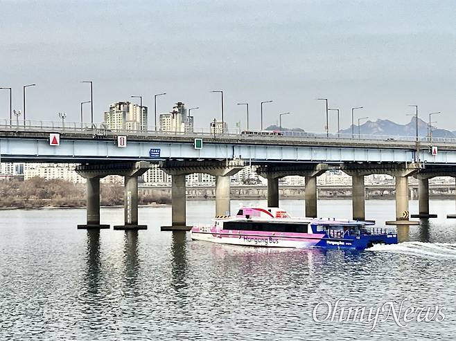| ▲ 한강버스가 12일 오후 여의도 선착장을 출발해 마포대교를 지나고 있다. |