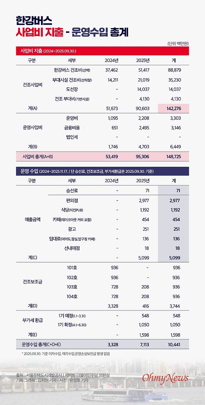 <오마이뉴스> 취재와 서미화 더불어민주당 의원실(비례대표)이 확보한 SH 자료를 종합하면 (주)한강버스는 2024년부터 올해 9월 30일까지 사업비 명목으로 총 1487억 2500만 원을 지출했다. 세부적으로 건조사업비(선박·선착장·도선장·기반시설)로 1422억 7600만 원을 썼다. 운영사업비 지출은 64억 4900만 원이었다.