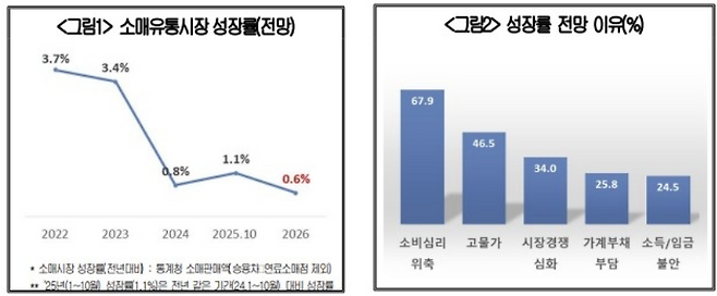 내년 국내 소매유통시장 성장률은 0.6%로 예상된다고 22일 대한상공회의소가 전국 소매유통업체 300개를 대상으로 실시한 '2026년 유통산업 전망조사' 결과에서 밝혔다.