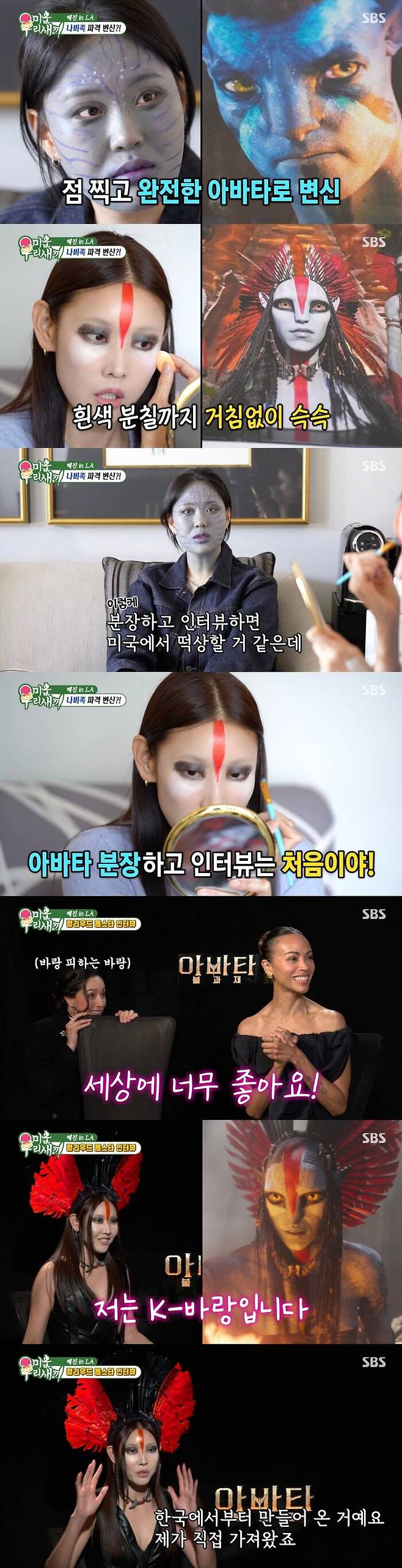 그러자 한혜진은 "미국도 없어. 그냥 최초야"라며 "이번 아바타 홍보를 위해 분장을 한 게 세계 최초야"라고 자신했다.