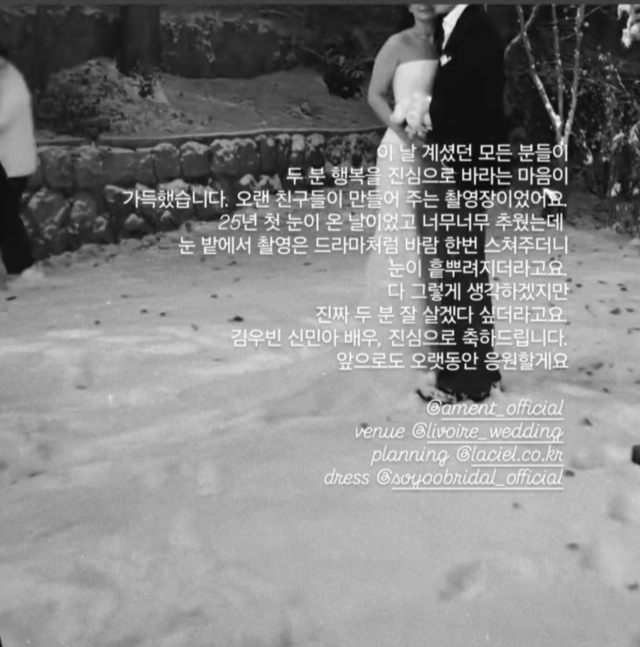 "첫눈이 내리던 날, 현장에 있던 모두가 두 사람의 행복을 진심으로 바랐다"며 "특히 신민아는 사람에 대한 의리를 지켜온 배우였고, 김우빈은 고통을 감사로 바꾼 사람처럼 보였다"고 밝혔다.