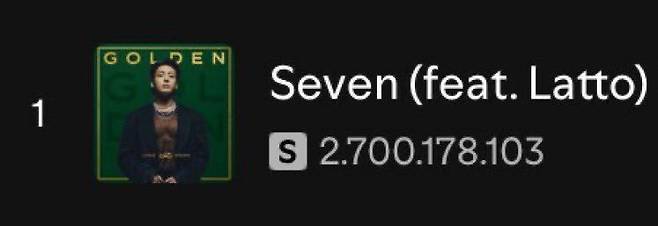‘Seven’은 발매 889일 만에 누적 스트리밍 27억17만8103회를 기록했다. 2023년 공개된 곡이지만 현재도 하루 평균 210만 회 이상 재생되며 꾸준한 존재감을 유지하고 있다. 시간이 흘러도 소비되는 속도가 떨어지지 않는다는 점에서 글로벌 메가 히트곡의 저력을 보여준다.