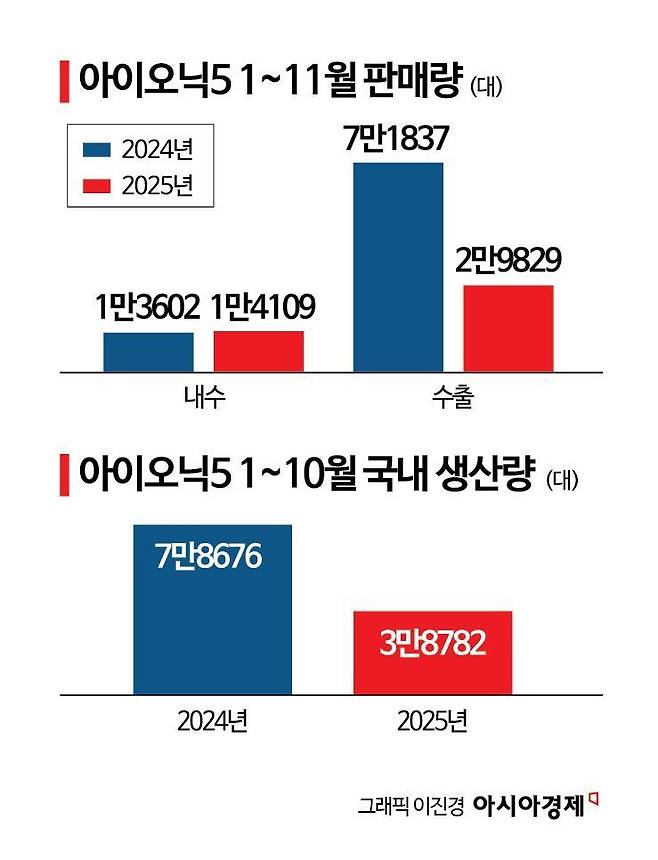 특히 주요 시장인 미국에서 관세로 인해 현지 생산량이 늘어나면서 수출에 악재로 작용했다. 올해 본격 가동된 미국 조지아주 현대차그룹 메타플랜트 아메리카(HMGMA)에서 올 3분기까지 누적 생산한 아이오닉 5는 3만9467대로 울산공장 생산량을 뛰어넘었다. 울산공장의 아이오닉5 생산대수는 올 1~3분기 3만3967대로 지난해 같은 기간(7만943대)의 절반 수준에 불과했다.