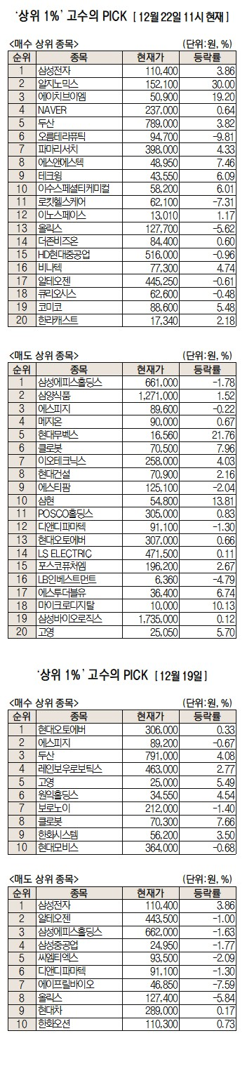 이날 미래에셋증권에 따르면 미래에셋증권 주식 거래 고객 중 최근 1개월 동안 투자수익률 상위 1%에 해당하는 '주식 초고수'들이 오전 11시까지 가장 많이 산 종목은 삼성전자다.