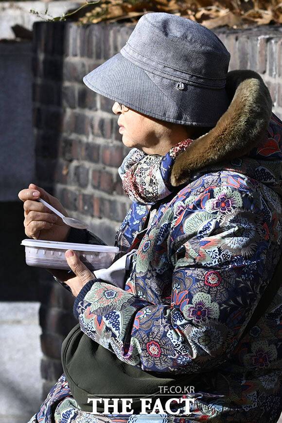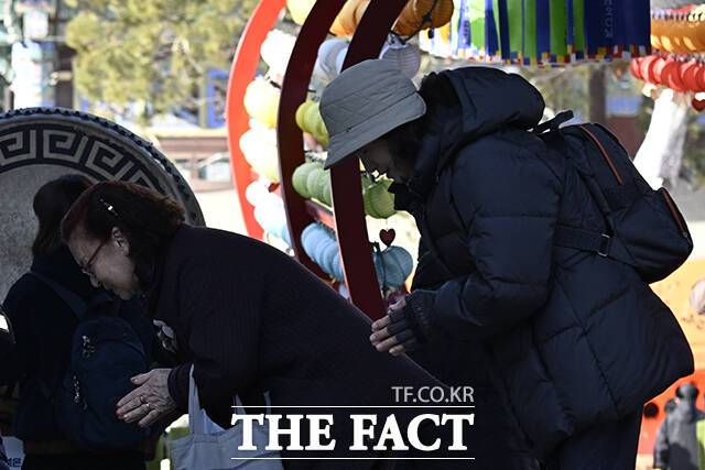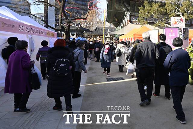 [더팩트ㅣ송호영 기자] 연중 밤이 가장 길고 낮이 가장 짧은 '동지'인 22일 오전 서울 종로구 조계사를 찾은 방문객들이 팥죽 교환권을 받고 있다.