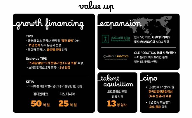 아울러 팁스(TIPS), 스케일업팁스, 한국소재부품장비투자기관협의회(KITIA) 등 다양한 운영사 지위를 기반으로 연구개발-상용화-확장으로 이어지는 단계별 자금조달 체계도 구축했다.