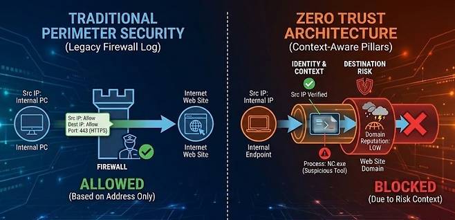 하지만 제로트러스트 관점에서 필러를 기반으로 통제할 경우 상황은 완전히 달라질 수 있다. 동일한 외부 443 포트로의 통신이라 하더라도, 일반적인 브라우저 트래픽이 아닌 Netcat 기반 통신이며, 더 나아가 평판 조회 결과가 좋지 않은 외부 사이트로 연결된다면, 이는 일상적 웹 통신이 아니라 데이터 유출을 위한 비정상 행위로 의심해야 한다.