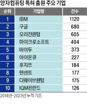 기업별로 보면 글로벌 기업 뿐 아니라 테크 스타트업 등을 중심으로 특허 경쟁이 심화되고 있다. 조사기간(2014~2023년)동안 최다 출원 기업은 IBM(1120건)으로 나타났다. 구글이 680건으로 2위다. 이어 중국 오리진퀀텀(605건), 마이크로소프트(404건), 중국 바이두(373건) 순이었다. 아이온큐(227건), 후지쯔(184건), 텐센트(177건), 디웨이브(175건), IQM핀란드(126건)가 뒤를 이었다. 특허 출원 증가율은 중국 양자기술 기업들(오리진퀀텀·바이두·텐센트)이 독보적으로 높았다.