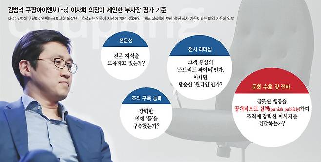 김 의장은 이메일 본문에 “지난 부사장(VP) 승진 논의에서 이야기했던 초안을 공유합니다. 계속 다듬어봅시다. 의견 주세요”라며 네 가지 평가 기준을 제시했다. 김 의장은 이 가운데 하나로 ‘문화 수호 및 공개 질책’(Defend Culture & Punish publicly) 능력을 꼽았다. 그러면서 김 의장은 해당 항목에 대해 “문화는 리더가 무엇을 용납하지 않는가에 의해 정의됩니다. 잘못된 사람이나 행동을 용납합니까? 올바른 리더에게 권한을 부여하고, 조직에 메시지를 강하게 전달하기 위해 잘못된 행동을 ‘공개적으로 질책’(punish publicly)합니까?”라고 썼다. 조직 내 업무 기강을 확립하기 위해 공개적으로 평가하고 질책하는 리더십을 장려한 셈이다.