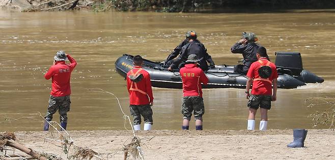 | ▲ 실종된 해병장병 찾는 전우들 2023년 7월 19일 오전 경북 예천군 호명면서 수색하던 해병대 장병 1명이 급류에 휩쓸려 실종된 가운데 해병대 특수수색대가 실종 지점에서 수색에 나서고 있다. |
