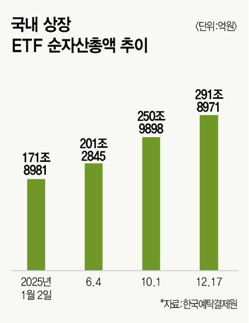 글로벌 증시가 활기를 띠자, 자연스럽게 ETF를 향한 투자자 관심이 높아졌다. ETF 시장은 지난해 말 173조원 규모에서 어느덧 300조원 시대를 목전에 뒀다. 12월 17일 기준 국내 ETF 순자산총액(AUM)은 291조원을 넘어섰다. 1년 사이 시장 규모가 70%가량 확대된 셈이다. 지난 6월 처음 200조원을 돌파한지 반년도 안 돼 90조원 이상 몸집을 불렸다. 이 같은 속도라면 2026년 초 300조원 시대가 열릴 전망이다.