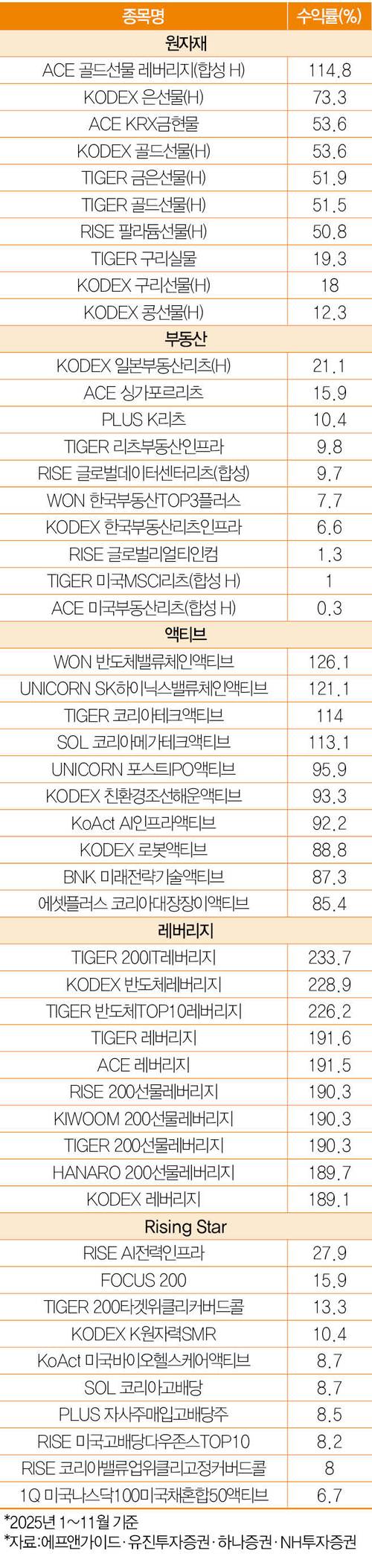 특히 원자재 부문에서 한국투자신탁운용의 공격적인 운용 전략이 적중했다는 평가다. ACE 골드선물 레버리지(합성 H)는 115% 수익률을 기록해, 금 선물 가격 상승폭을 크게 웃돌았다. KRX 금 현물지수를 추종하는 ACE KRX금현물 역시 3위에 올랐다.