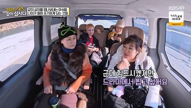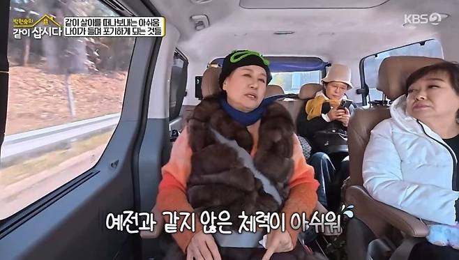 집으로 이동하는 길 박원숙은 "몸이 힘들어서 제의가 와도 못한다는 게 아쉽다. 원초적인 게 아쉽다. 내가 얼마나 일을 좋아하는데"라고 털어놨다.