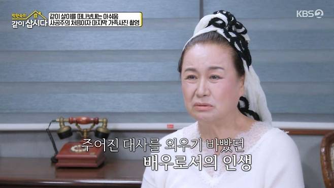 그러면서 박원숙은 "이제는 모르겠다. 쉬고 몸이 좋아져서 할 의욕이 생기면 죽기 전에 조그만 역이라도 꼭 해보고 싶다는 생각이 불쑥 생기다가도 '힘들어. 어떡해'라는 생각이 든다"고 고백했다.