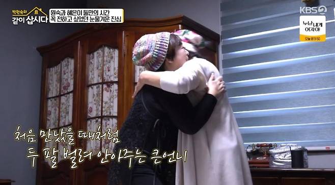 박원숙은 "애썼어"라며 혜은이의 손을 꼭 잡았고, 혜은이는 "고모가 바보 같은 저를 참아주느라고 고생하셨다"고 진심을 전했다. 박원숙은 "이 프로그램은 혜은이의 육아일기였다. 그래도 힘든 시절을 다 지난 것 같아 마음이 편하다"고 위로했다. 혜은이는 "처음 이 프로그램 시작할 때 언덕을 올라가고 있었는데 이제는 넓은 평야와 꽃길을 걷는 것 같다"고 답했다.