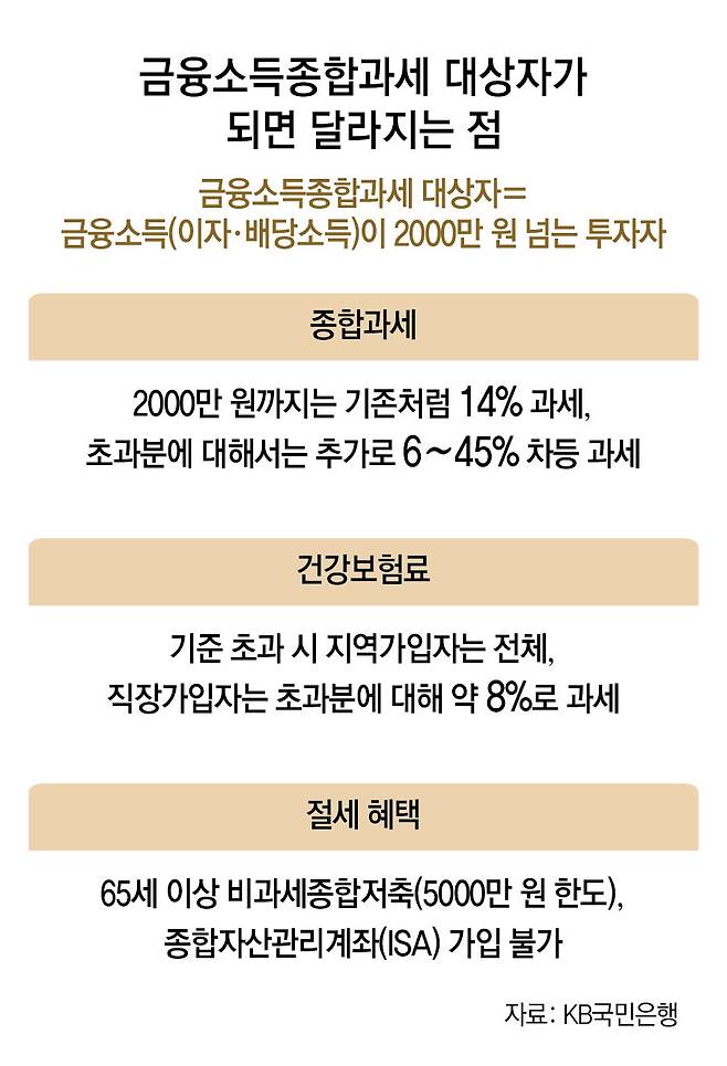 한 해 동안 번 이자와 배당소득이 2000만 원을 넘기면 금융소득종합과세 대상자가 돼, 최고세율이 45%에 달하는 종합소득세를 내야 하고 건강보험료에도 영향을 미치기 때문이다.