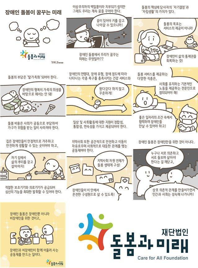 장애인 돌봄은 장애인만을 위한 것이 아니다. 누구나 서로 의존하고 서로 돌보며 살아야 한다는 것을 깨닫고 상호 의존적 관계를 만들어가면서 인간과 사회는 차츰 성숙해 나간다. 장애인 돌봄은 장애인뿐만 아니라 비장애인을 위한 것이고 장애인과 비장애인이 함께 어울려 사는 공동체를 만드는 일이다.