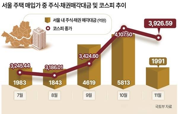 주식·채권 매각대금이 서울 주택 매수 금액에서 차지하는 비중도 점차 높아졌다. 코스피 종가가 3000선이었던 7월과 8월 이 비중은 각각 3.47%, 3.86%에 그쳤지만 코스피 종가가 3424.60을 기록한 9월에는 이 비중이 4.18%로 증가했다. 이후 4107.50을 찍은 10월에는 4.91%까지 급등했다.