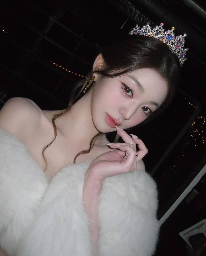 공개된 사진 속 그룹 아이브 장원영은 반짝이는 티아라와 화이트 퍼, 순백의 드레스 조합으로 '겨울 공주' 스타일을 완성하며 고급스러운 무드를 드러냈다.