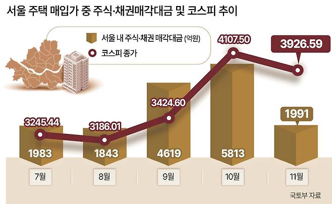 주식·채권 매각대금이 서울 주택 매수 금액에서 차지하는 비중도 점차 높아졌다. 코스피 종가가 3000선이었던 7월과 8월 이 비중은 각각 3.47%, 3.86%에 그쳤지만 코스피 종가가 3424.60을 기록한 9월에는 이 비중이 4.18%로 증가했다. 이후 4107.50을 찍은 10월에는 4.91%까지 급등했다.