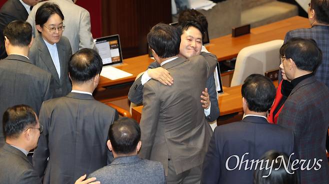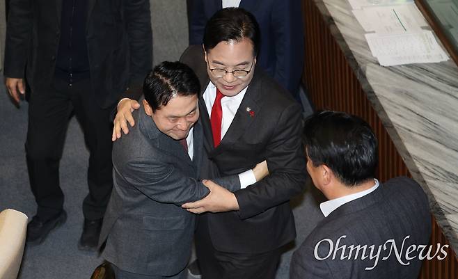 | ▲ 장동혁 국민의힘 대표가 23일 오전 서울 여의도 국회에서 열린 본회의에서 12.3 윤석열 비상계엄 등에 대한 전담재판부 설치 및 제보자 보호 등에 관한 특별법안에 대해 무제한 반대토론을 마친 뒤 송언석 원내대표로부터 격려를 받고 있다. |