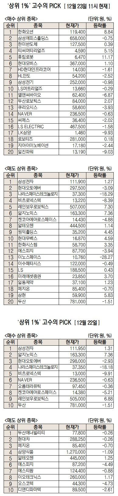 이날 미래에셋증권에 따르면 미래에셋증권 주식 거래 고객 중 최근 1개월간 투자 수익률 상위 1%에 해당하는 '주식 초고수'들이 오전 11시까지 가장 많이 사들인 종목은 한화오션이다.