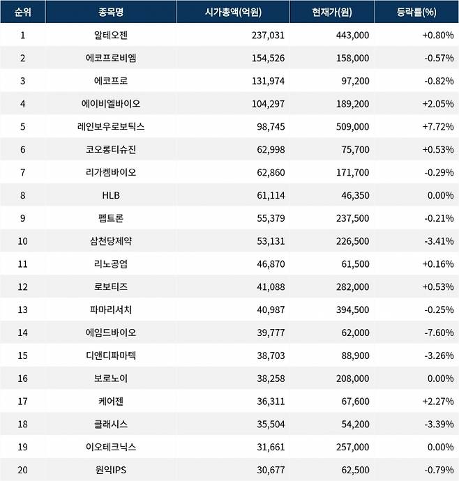 에코프로(086520)는 시가총액 13조 1974억원으로 0.82% 하락 중이다. 에이비엘바이오(298380)는 10조 4297억원의 시가총액을 기록하며 2.05% 상승세를 보이고 있다. 레인보우로보틱스(277810)는 9조 8745억원의 시가총액으로 7.72% 급등하고 있으며, 코오롱티슈진(950160)은 6조 2998억원으로 0.53% 상승 중이다. 리가켐바이오(141080)는 6조 2860억원의 시가총액으로 0.29% 하락하고 있다. HLB(028300)는 6조 1114억원으로 보합세를 유지하고 있으며, 펩트론(087010)은 5조 5379억원으로 0.21% 하락하고 있다. 삼천당제약(000250)은 5조 3131억원의 시가총액으로 3.41% 하락 중이다.