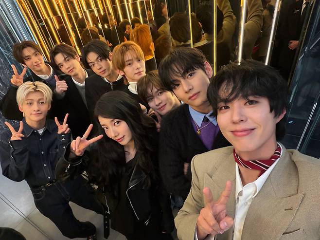 이어 박보검은 해당 브랜드의 또 다른 엠버서더인 그룹 투어스(TWS)와 함께한 사진도 공개했다. 가요계 대선배인 박보검, 뷔, 수지 사이에서 풋풋한 매력을 발산하는 투어스 멤버들의 모습은 행사장 분위기를 더욱 활기차게 만들었다.