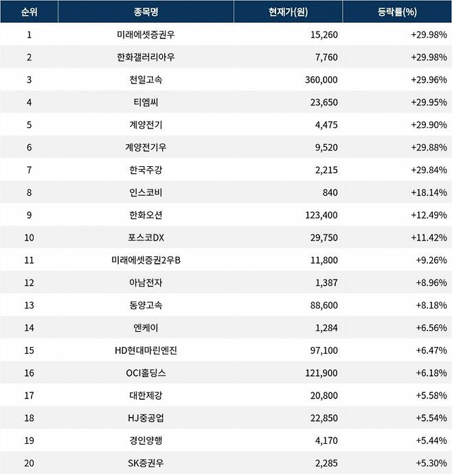 6위 계양전기우(012205)는 종가 9,520원으로 29.88% 상승 마감했다. 7위 한국주강(025890)은 종가 2,215원으로 29.84% 상승 마감했다. 8위 인스코비(006490)는 종가 840원으로 18.14% 상승 마감했다. 9위 한화오션(042660)은 종가 123,400원으로 12.49% 상승 마감했다. 10위 포스코DX(022100)는 종가 29,750원으로 11.42% 상승 마감했다.