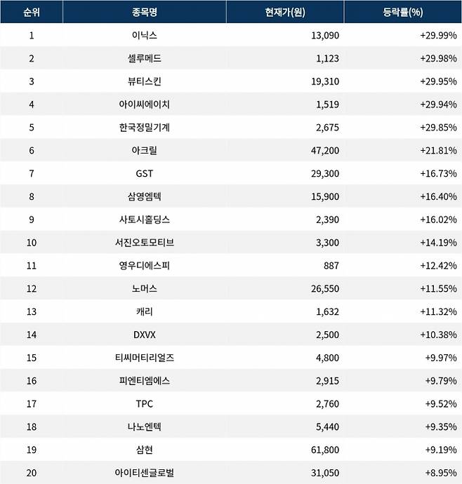 6위 아크릴(0007C0)은 종가 47,200원으로 21.81% 상승 마감했다. 7위 GST(083450)는 종가 29,300원으로 16.73% 상승 마감했다. 8위 삼영엠텍(054540)은 종가 15,900원으로 16.40% 상승 마감했다. 9위 사토시홀딩스(223310)는 종가 2,390원으로 16.02% 상승 마감했다. 10위 서진오토모티브(122690)는 종가 3,300원으로 14.19% 상승 마감했다.