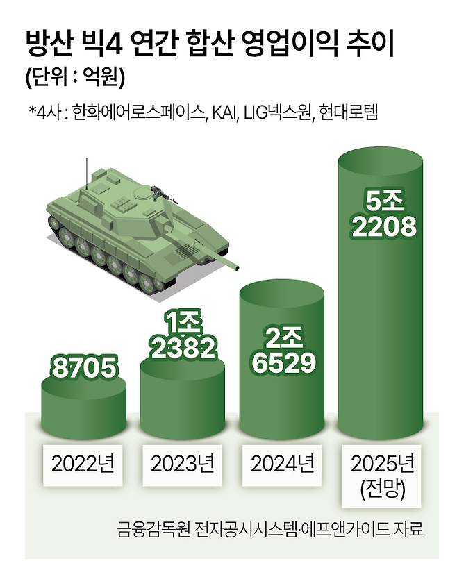 23일 금융정보업체 에프앤가이드에 따르면 방산 4사의 2025년 연간 합산 영업이익 컨센서스는 사상 최대 수준인 총 5조2208억원에 달했다.