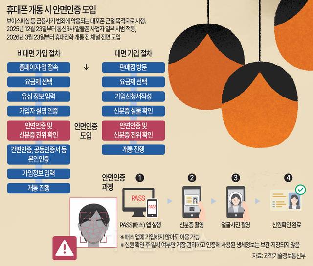 통신업계에 따르면 이날부터 신규 휴대전화 개통이나 기기 변경, 명의 변경 시에는 의무적으로 안면인증 절차를 거쳐야 한다. 안면인증은 이동통신 3사가 공동으로 운영하는 패스(PASS) 앱을 통해 이뤄진다. 이용자가 스마트폰 카메라로 얼굴을 촬영하면 시스템이 실시간으로 본인 여부를 판별하는 방식이다. 3개월 간의 시범 기간을 거쳐 공식 시행된다.