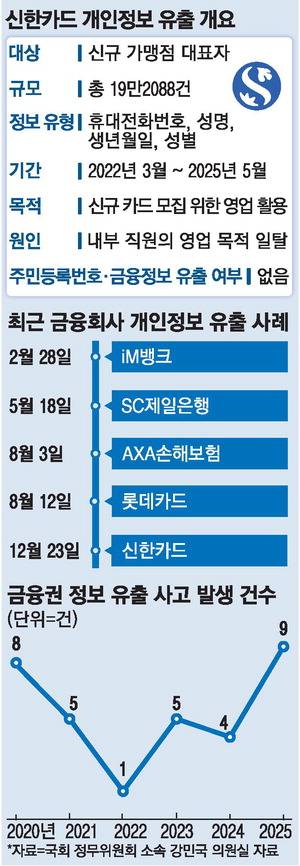 올해에만 대형 개인정보 유출 사고가 SK텔레콤, KT, 롯데카드, 쿠팡에 이어 신한카드에서까지 발생하면서 사회 전반의 불안감이 커지는 형국이다. 지난 4월 SK텔레콤에서 가입자 2696만여 명의 개인정보 25개 항목이 유출됐다. 가입자식별번호(IMSI), 단말기식별번호(IMEI) 등 개인을 특정할 수 있는 핵심 정보까지 포함되자 대리점마다 유심을 교체하려는 사람들이 몰려들어 이른바 '유심 대란'이 벌어졌다. 지난 8월 KT에서는 불법 기지국 장비를 활용한 범죄 피해로 가입자 2만2227명의 개인정보가 유출됐다. 이 가운데 368명은 약 2억4000만원 규모의 무단 소액결제 피해를 입었다. 같은 달 롯데카드 이용자 296만명의 정보가 유출되는 사고가 발생했다. 일부 회원은 연계정보(CI), 가상결제 코드 등이 유출되기도 했다.