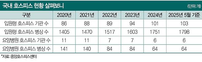 하지만 호스피스 이용은 현실적으로 쉽지 않다. 중앙호스피스센터에 따르면, 지난 5월 기준 전국 입원형 호스피스 전문기관은 103개소에 불과하다. 입원형 호스피스 병상 수도 1798개에 그친다. 유럽완화의료협회(EAPC) 등은 인구 100만명당 병상 수가 50개는 돼야 한다고 말한다. 하지만 한국은 100만명당 35개 수준(인구 5170만명, 병상 수 1798개)이다. 더군다나 호스피스 대부분이 수도권에 집중돼 거주지에 따라 접근 가능성이 떨어진다. 정부도 심각성을 인지하고 대책을 세우고 있는 점은 다행이다. 2028년까지 호스피스 전문기관을 360곳으로 확충해 이용률도 2023년 말 기준 33%에서 50%까지 늘린다는 계획을 추진 중이다.