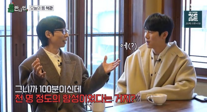 유연석의 구체적인 팬들 언급에도 불구하고 유재석은 "천 명 맞냐. 한 백 분 계시는데 천 명이라 한 거 아니냐"고 의심을 거두지 못했다.