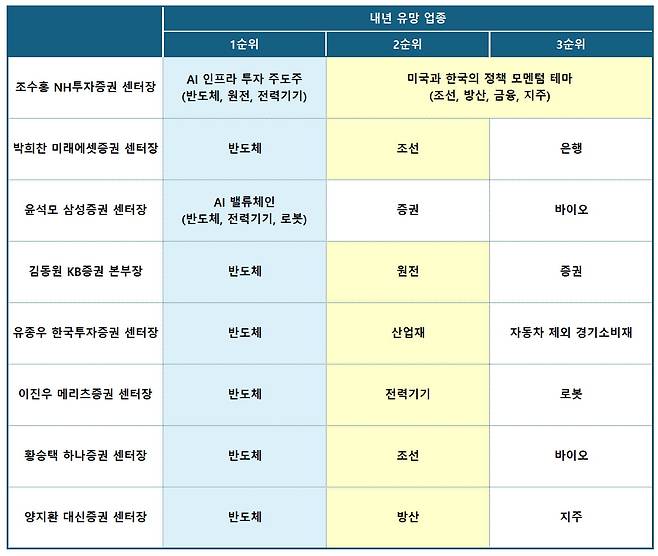 주요 증권사 센터장들은 내년 국내 증시에서 주목해야 할 유망 업종으로 이견 없이 ‘반도체’를 첫손에 꼽았다. 인공지능(AI) 데이터센터 투자가 이어지면서 메모리반도체 공급 부족이 장기화할 것으로 전망해서다. 미국이 주도하는 공급망 재편 과정에서 수혜가 기대되는 전력 인프라와 조선·방산 등 산업재도 복수의 리서치센터장에게 유망 업종으로 선택됐다.