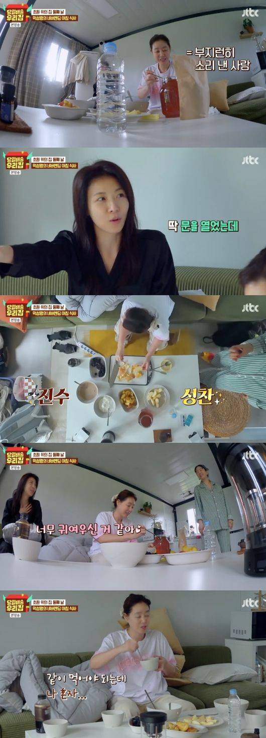 너무 이른 아침이라 모두가 식사를 제대로 하지 못하는 가운데, 김성령은 과일, 요거트, 숭늉을 먹으며 독보적인 '먹짱'의 위엄을 자랑했다.