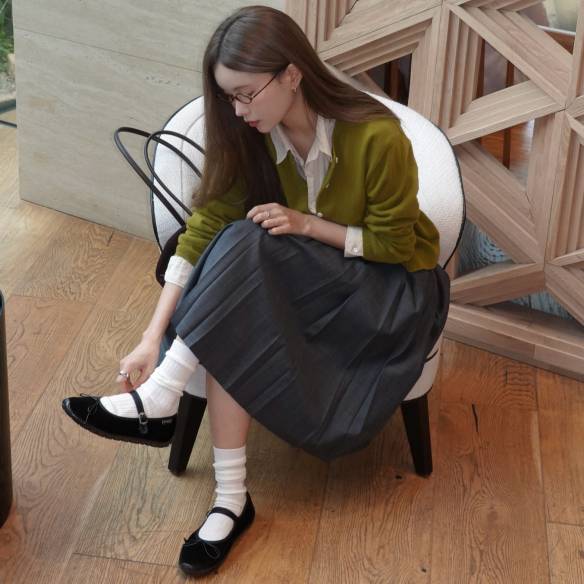 가장 기본적이기에 가장 강력한, 흰 양말은 메리제인의 영원한 단짝입니다. 흰 양말과 메리제인 신발 조합은 빈티지한 롱 스커트나 미니멀한 코트 등 어떤 스타일과도 유연하게 어우러지죠. 이때 양말의 길이를 조절해 발목과 종아리 사이 기장으로 연출하면 프레피하면서도 단정한 인상을 줄 수 있습니다.