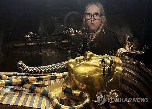 A tourist views one of Egypt's famed King Tutankhamun's golden sarcophagus at the Grand Egyptian Museum in Giza, Egypt, Tuesday, Dec. 23, 2025. (AP Photo/Amr Nabil)