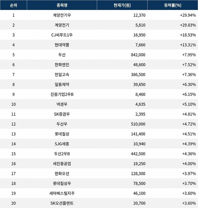 이어 상승률 2위 계양전기(012200)는 현재가 5810원으로 주가가 +29.83% 상한가를 기록하고 있다. 상승률 3위 CJ씨푸드1우(011155)는 현재 1만 6950원으로 +18.53% 급등하며 활발히 거래되고 있다. 상승률 4위 현대약품(004310)은 +13.31% 상승하며 7660원에 거래되고 있다. 상승률 5위 두산(000150)은 +7.95%의 상승세를 타고 84만 2000원에 거래되고 있다.