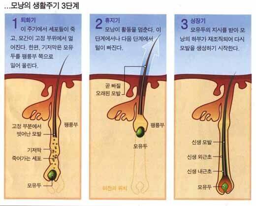 머리카락이 만들어지는 곳은 두피 속 모낭 바닥에 둥글게 부풀어 있는 모구(hair bulb) 안의 모유두(dermal papilla)라는 혈관·신경 덩어리다. 이곳에 산소와 영양분이 공급되면서 머리카락이 만들어지기 시작한다. 모모세포라는 각질세포가 분열하면서 단단해지고, 이 덩어리가 위로 밀려 올라오며 우리 눈에 보이는 머리카락이 된다. 두피 밖으로 삐죽이 솟아나온 머리카락은 사실은 죽은 단백질(케라틴) 덩어리다. 머리카락이 자라는 기간은 대략 2~6년이다(성장기). 그런 다음 성장을 멈췄다가(휴지기) 두세달 후 빠져버린다(퇴화기).