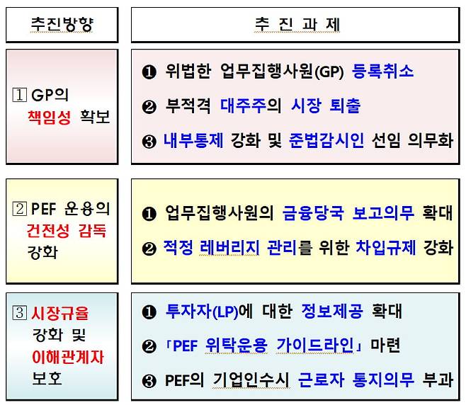 금융위원회가 22일 발표한 ‘기관전용 PEF 제도 개선안'은 PEF 전반에 대한 관리·감독과 내부통제를 강화하는 것이 골자다. 운용자산(AUM) 5000억원 이상 운용사에 준법감시인 선임을 의무화하는 한편, 차입·레버리지 규율을 정비하고 중대한 법규 위반에 대해서는 강력한 제재가 가능하도록 제도를 손질했다.