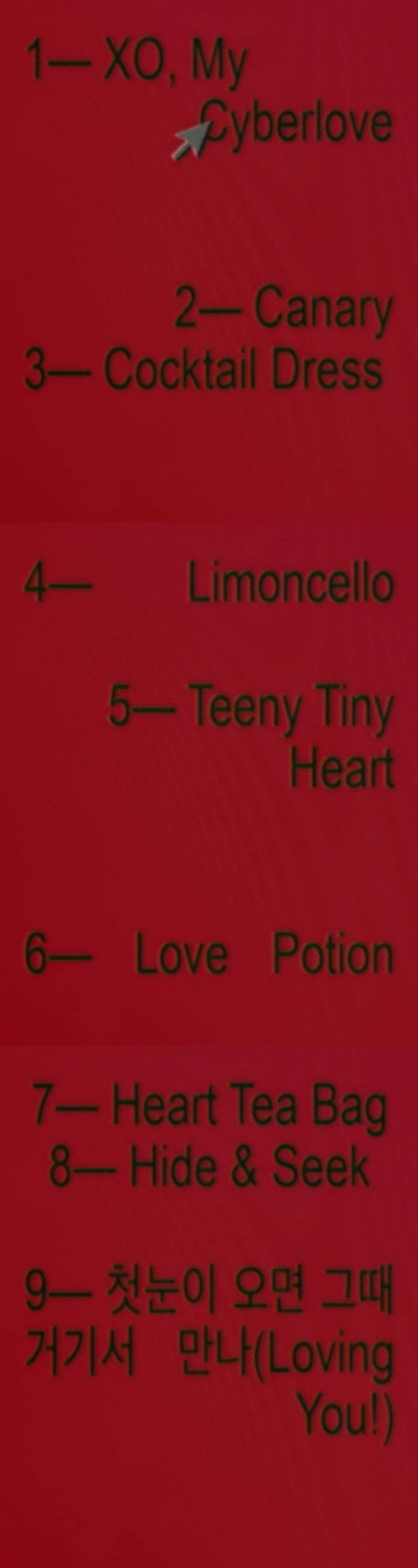 컴퓨터 모니터 화면을 연상시켰다. 강렬한 레드 컬러 배경에는 검은색 타이핑으로 곡 제목을 암시하는 리스트가 배열돼 있었다.