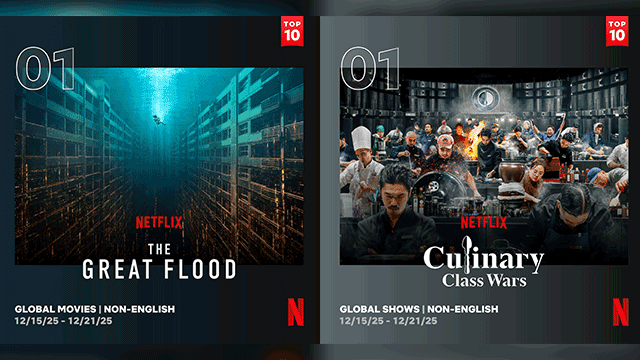 넷플릭스 영화 '대홍수'와 요리 경연 예능 '흑백요리사: 요리 계급 전쟁2'가 각각 글로벌 TOP 10 영화 비영어 부문과 TV쇼 비영어 부문 1위에 동시에 올랐습니다.