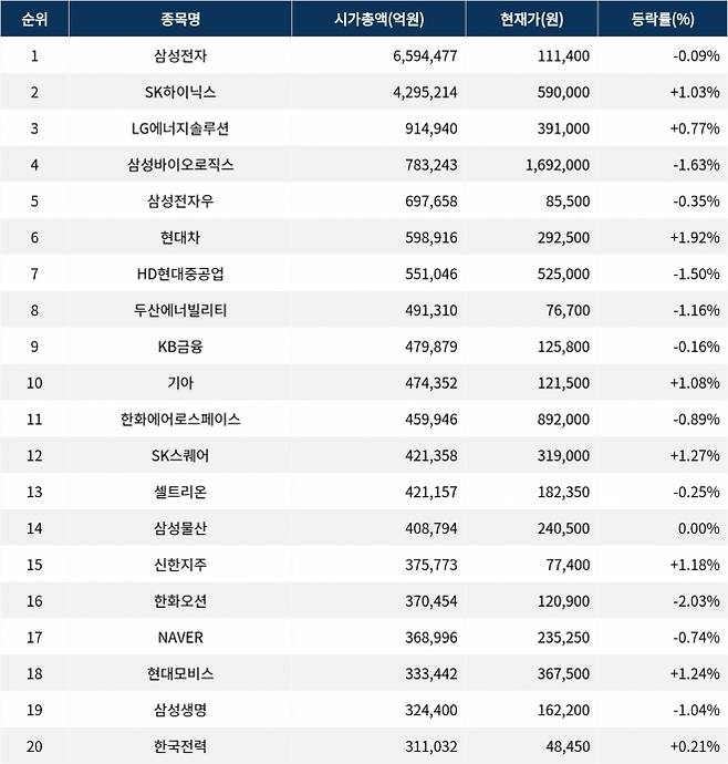 LG에너지솔루션(373220)은 39만 1000원으로 0.77% 상승했으며, 삼성바이오로직스(207940)는 169만 2000원으로 1.63% 하락했다. 삼성전자우(005935)는 8만 5500원으로 전 거래일 대비 0.35% 하락했다. 현대차(005380)는 29만 2500원으로 1.92% 상승했고, HD현대중공업(329180)은 52만 5000원으로 1.50% 하락했다. 두산에너빌리티(034020)는 7만 6700원으로 1.16% 하락, KB금융(105560)은 12만 5800원으로 0.16% 하락했다. 기아(000270)는 12만 1500원으로 1.08% 상승했다.