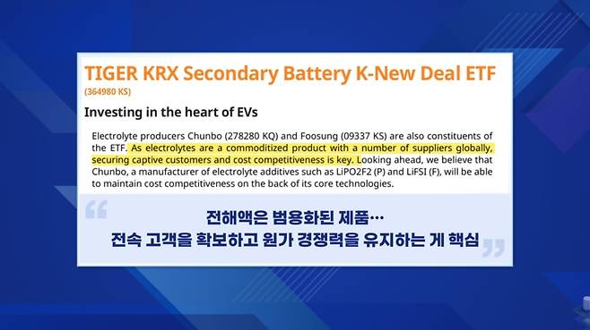 미래에셋증권 관련 ETF 리포트에서는 "전해액은 글로벌 공급 업체가 다수 존재하는 범용화된 제품"이라고 설명하고 있습니다.