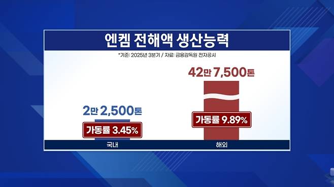현재 엔켐의 전해액 생산능력은 올해 3분기 기준 국내가 2만2,500톤, 해외가 42만7,500톤입니다.